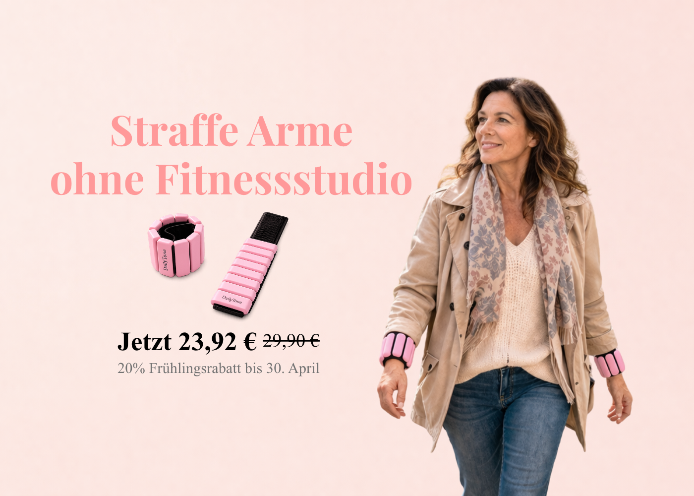 Für sichtbare Ergebnisse empfehlen wir, die DailyTone Armbandgewichte mehrmals pro Woche im Alltag zu tragen. Schon 20 bis 30 Minuten beim Spazierengehen, Putzen oder Kochen können helfen, die Arme stärker zu beanspruchen und langfristig zu straffen.