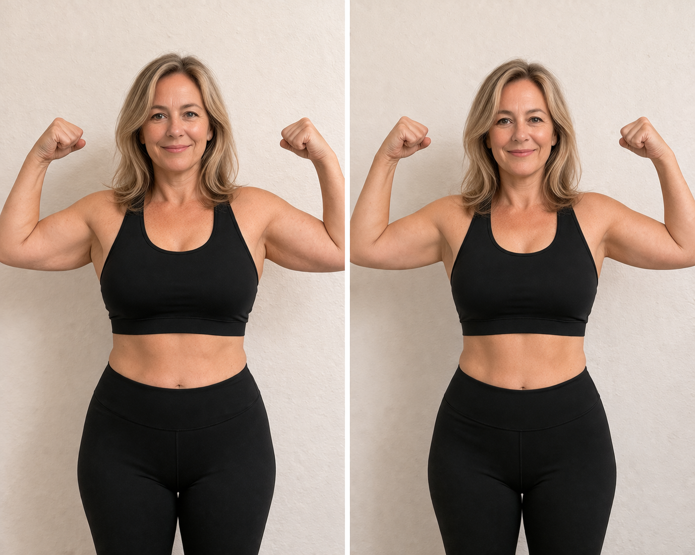 Vorher: Trotz Spaziergängen, Haushalt und wenig Zeit fürs Fitnessstudio bleiben die Arme oft weich und undefiniert. Gerade ab 50 stören viele Frauen die sogenannten Winkearme und wünschen sich straffere Oberarme.